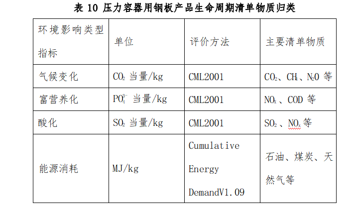 ? 根據清單物質(zhì)的物理化學(xué)性質(zhì),將對某影響類(lèi)型有貢獻的物質(zhì)?歸到一起,例如,將對氣候變化有貢獻的二氧化碳、甲烷、氧化亞?氮等清單物質(zhì)歸到酸化影響類(lèi)型里面。壓力容器用鋼板評價(jià)所用環(huán)境影響類(lèi)型指標及其主要清單物質(zhì)見(jiàn)表?10。