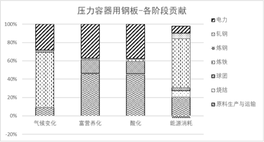 ? 壓力容器用鋼板生命周期各階段對氣候變化、富營(yíng)養化、酸化、能源消耗指標的貢獻比例見(jiàn)圖?3?所示。