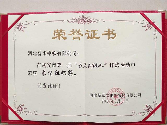 8月16日,武安市首屆“最美鋼鐵人”評選結果揩曉:我公司焦化廠(chǎng)廠(chǎng)長(cháng)張勝利、普陽(yáng)煉鋼廠(chǎng)廠(chǎng)長(cháng)石劍飛、中普煉鐵廠(chǎng)廠(chǎng)長(cháng)申建軍,榮獲此次活動(dòng)的前三名;申習民、王旗杰、?,F利榮獲“優(yōu)秀獎”。同時(shí),我公司還榮獲“最佳組織獎”。