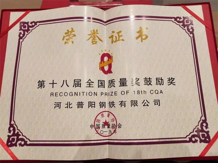 日前,2018年-2019年中國質(zhì)量協(xié)會(huì )以“卓越引領(lǐng)——邁入高質(zhì)量發(fā)展新時(shí)代”為主題,開(kāi)展了第十八屆全國質(zhì)量獎評審工作。評審工作堅持“高標準、少而精、樹(shù)標桿”的原則,經(jīng)過(guò)嚴格的資格審查、資料評審、現場(chǎng)評審、評審委員會(huì )審議、網(wǎng)上公示、審定委員會(huì )審定并征集相關(guān)部委意見(jiàn),決定授予河北普陽(yáng)鋼鐵有限公司“第十八屆全國質(zhì)量獎鼓勵獎”榮譽(yù)稱(chēng)號。