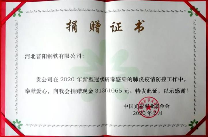 其中,通過(guò)中共武安市委統戰部和市工商聯(lián)向中國光彩基金會(huì )捐獻人民幣3136.25萬(wàn)元(含員工捐款136.25萬(wàn)元),定向用于武漢地區的疫情防控工作。為大力支持武安市疫情防控工作,普陽(yáng)鋼鐵集團向武安市第一人民醫院(康二城煤礦隔離病區)捐獻人民幣600萬(wàn)元,定向用于采購必備的醫療物資。
